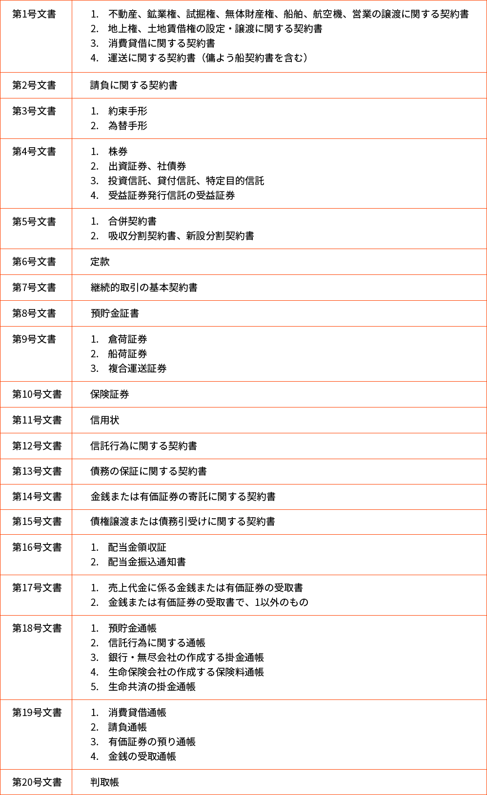 下表は、印紙税法別表第一に定められている全20種の課税文書の一覧です。詳しくは後述しますが、製造請負契約書は表の「第2号文書(請負に関する契約書)」に該当します。