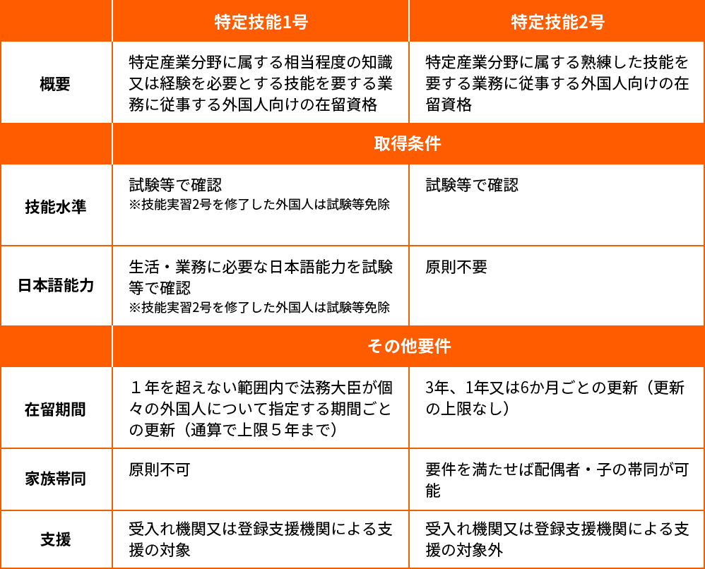 技能試験や日本語能力試験などの取得条件、在留期間、家族帯同の可否などを整理すると以下のとおりです。